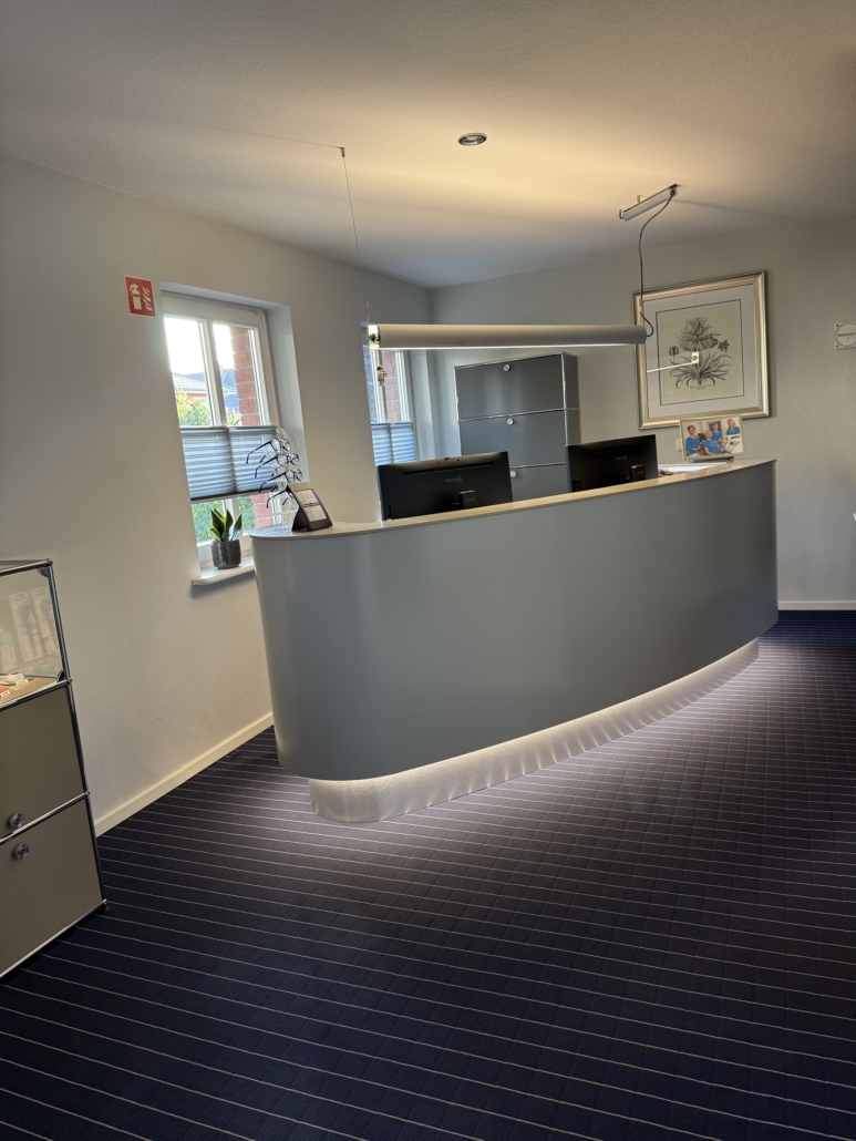 Hier bekommen Sie einen Eindruck von unseren modernen und freundlichen Praxisräumen. Stets gepflegt, in ästhetischem und zeitlosen Weiß gehalten und mit modernster, zahnmedizinischer Technik ausgerüstet vermittelt die Praxis unseren Patienten ein Gefühl von Entspannung und Wohlbefinden.